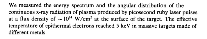 We measured the energy spectrum and the angular distribution of the continuous x-ray radiation of plasma produced by picosecond ruby laser pulses at a flux density of ~1014 W/cm2 at the surface of the target. The effective temperature of epithermal electrons reached 5 keV in massive targets made of different metals.