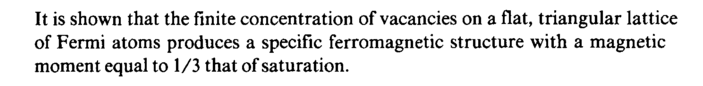 It is shown that the finite concentration of vacancies on a flat, triangular lattice of Fermi atoms produces a specific ferromagnetic structure with a magnetic moment equal to 1/3 that of saturation.