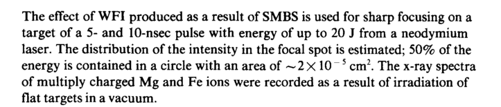 The effect of WFI produced as a result of SMBS is used for sharp focusing on a target of a 5and 10-nsec pulse with energy of up to 20 J from a neodymium laser. The distribution of the intensity in the focal spot is estimated; 50% of the energy is contained in a circle with an area of ~2 X 10 ~5 cm2. The x-ray spectra of multiply charged Mg and Fe ions were recorded as a result of irradiation of flat targets in a vacuum.