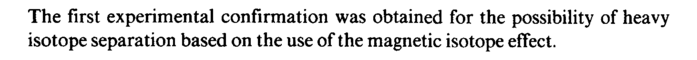 The first experimental confirmation was obtained for the possibility of heavy isotope separation based on the use of the magnetic isotope effect.