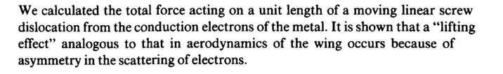 We calculated the total force acting on a unit length of a moving linear screw dislocation from the conduction electrons of the metal. It is shown that a "lifting effect" analogous to that in aerodynamics of the wing occurs because of asymmetry in the scattering of electrons.