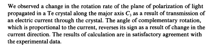 We observed a change in the rotation rate of the plane of polarization of light propagated in а Те crystal along the major axis C3 as a result of transmission of an electric current through the crystal. The angle of complementary rotation, which is proportional to the current, reverses its sign as a result of change in the current direction. The results of calculation are in satisfactory agreement with the experimental data.