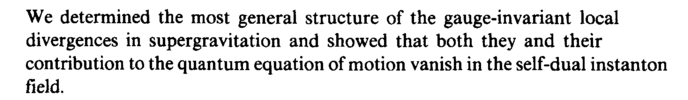 We determined the most general structure of the gauge-invariant local divergences in supergravitation and showed that both they and their contribution to the quantum equation of motion vanish in the self-dual instanton field.