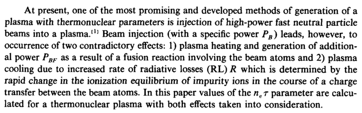 At present, one of the most promising and developed methods of generation of a plasma with thermonuclear parameters is injection of high-power fast neutral particle beams into a plasma.1'1 Beam injection (with a specific power PB) leads, however, to occurrence of two contradictory effects: 1) plasma heating and generation of additional power PBF as a result of a fusion reaction involving the beam atoms and 2) plasma cooling due to increased rate of radiative losses (RL) R which is determined by the rapid change in the ionization equilibrium of impurity ions in the course of a charge transfer between the beam atoms. In this paper values of the ne τ parameter are calculated for a thermonuclear plasma with both effects taken into consideration.