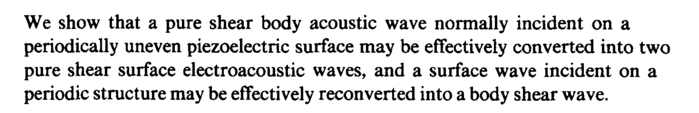 We show that a pure shear body acoustic wave normally incident on a periodically uneven piezoelectric surface may be effectively converted into two pure shear surface electroacoustic waves, and a surface wave incident on a periodic structure may be effectively reconverted into a body shear wave.