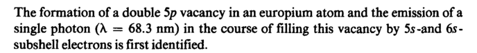 The formation of a double 5p vacancy in an europium atom and the emission of a single photon (λ = 68.3 nm) in the course of filling this vacancy by 5s-and 6s-subshell electrons is first identified.