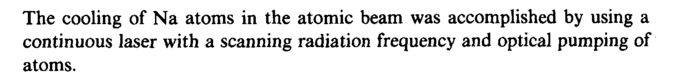 The cooling of Na atoms in the atomic beam was accomplished by using a continuous laser with a scanning radiation frequency and optical pumping of atoms.