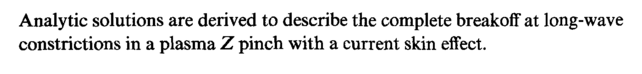 Analytic solutions are derived to describe the complete breakoff at long-wave constrictions in a plasma Ζ pinch with a current skin effect.