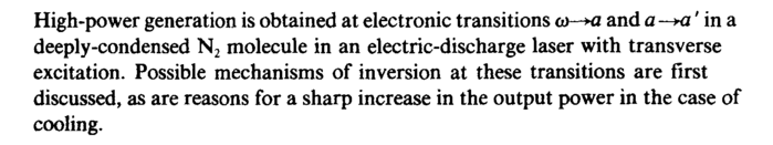 High-power generation is obtained at electronic transitions ω-*α and a-+a' in a deeply-condensed N2 molecule in an electric-discharge laser with transverse excitation. Possible mechanisms of inversion at these transitions are first discussed, as are reasons for a sharp increase in the output power in the case of cooling.