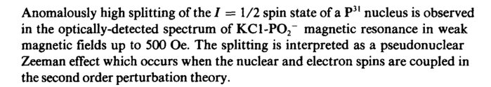 Anomalously high splitting of the 1=1/2 spin state of a P31 nucleus is observed in the optically-detected spectrum of KC1-P02~ magnetic resonance in weak magnetic fields up to 500 Oe. The splitting is interpreted as a pseudonuclear Zeeman effect which occurs when the nuclear and electron spins are coupled in the second order perturbation theory.