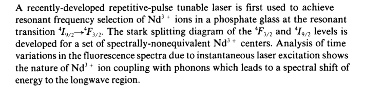 A recently-developed repetitive-pulse tunable laser is first used to achieve resonant frequency selection of Nd3 4 ions in a phosphate glass at the resonant transition %n—*FyiThe stark splitting diagram of the 4F3/2 and %/2 levels is developed for a set of spectrally-nonequivalent Nd3 + centers. Analysis of time variations in the fluorescence spectra due to instantaneous laser excitation shows the nature of Nd3 + ion coupling with phonons which leads to a spectral shift of energy to the longwave region.