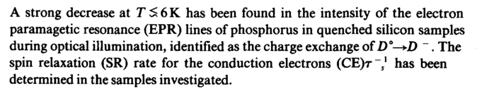 A strong decrease at TS6K has been found in the intensity of the electron paramagetic resonance (EPR) lines of phosphorus in quenched silicon samples during optical illumination, identified as the charge exchange of D°—>D ~. The spin relaxation (SR) rate for the conduction electrons (CE)rhas been determined in the samples investigated.