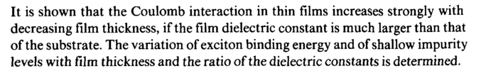 It is shown that the Coulomb interaction in thin films increases strongly with decreasing film thickness, if the film dielectric constant is much larger than that of the substrate. The variation of exciton binding energy and of shallow impurity levels with film thickness and the ratio of the dielectric constants is determined.