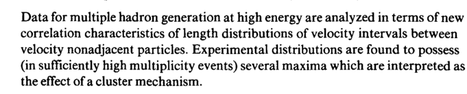 Data for multiple hadron generation at high energy are analyzed in terms of new correlation characteristics of length distributions of velocity intervals between velocity nonadjacent particles. Experimental distributions are found to possess (in sufficiently high multiplicity events) several maxima which are interpreted as the effect of a cluster mechanism.
