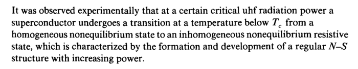 It was observed experimentally that at a certain critical uhf radiation power a superconductor undergoes a transition at a temperature below Tc from a homogeneous nonequilibrium state to an inhomogeneous nonequilibrium resistive state, which is characterized by the formation and development of a regular N-S structure with increasing power.