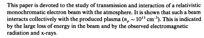This paper is devoted to the study of transmission and interaction of a relativistic monochromatic electron beam with the atmosphere. It is shown that such a beam interacts collectively with the produced plasma ~ 1013 cm 3). This is indicated by the large loss of energy in the beam and by the observed electromagnetic radiation and x-rays.