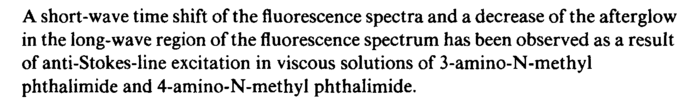 A short-wave time shift of the fluorescence spectra and a decrease of the afterglow in the long-wave region of the fluorescence spectrum has been observed as a result of anti-Stokes-line excitation in viscous solutions of 3-amino-N-methyl phthalimide and 4-amino-N-methyl phthalimide.