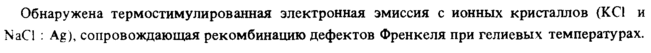 Обнаружена термостимулированная электронная эмиссия с ионных кристаллов (КС1 и NaCl : Ag), сопровождающая рекомбинацию дефектов Френкеля при гелиевых температурах.