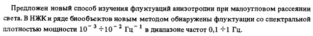 Предложен новый способ изучения флуктуаций анизотропии при малоугловом рассеянии света. В НЖКи ряде биообъектов новым методом обнаружены флуктуации со спектральной плотностью мощности 10~3-М0"2Гц"1в диапазоне частот 0,1 -М Гц.