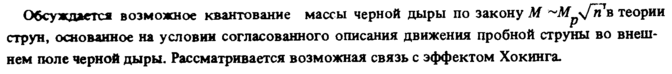 Обсуждается возможное квантование массы черной дыры по закону Μ ^M^sfrtb теории струн, основанное на условии согласованного описания движения пробной струны во внешнем поле черной дыры. Рассматривается возможная связь с эффектом Хокинга.