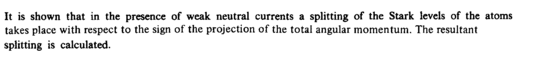 It is shown that in the presence of weak neutral currents a splitting of the Stark levels of the atoms takes place with respect to the sign of the projection of the total angular momentum. The resultant splitting is calculated.