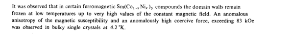 It was observed that in certain ferromagnetic Sm(Co! .xNix )5 compounds the domain walls remain frozen at low temperatures up to very high values of the constant magnetic field. An anomalous anisotropy of the magnetic susceptibility and an anomalously high coercive force, exceeding 83 kOe was observed in bulky single crystals at 4.2 °K.