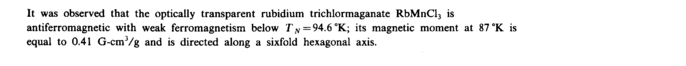 It was observed that the optically transparent rubidium trichlormaganate RbMnCl3 is antiferromagnetic with weak ferromagnetism below Ϊ\ = 94.6°Κ; its magnetic moment at 87°K is equal to 0.41 G-cm3/g and is directed along a sixfold hexagonal axis.