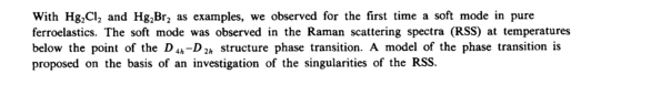 With Hg2Cl2 and Hg2Br2 as examples, we observed for the first time a soft mode in pure ferroelastics. The soft mode was observed in the Raman scattering spectra (RSS) at temperatures below the point of the D 4h-D 2h structure phase transition. A model of the phase transition is proposed on the basis of an investigation of the singularities of the RSS.