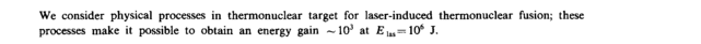 We consider physical processes in thermonuclear target for laser-induced thermonuclear fusion; these processes make it possible to obtain an energy gain ~103 at £las=106 J.