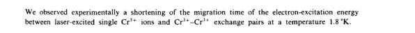 We observed experimentally a shortening of the migration time of the electron-excitation energy between laser-excited single Cr3+ ions and Cr3+-Cr3+ exchange pairs at a temperature 1.8 °K.