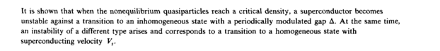It is shown that when the nonequilibrium quasiparticles reach a critical density, a superconductor becomes unstable against a transition to an inhomogeneous state with a periodically modulated gap Δ. At the same time, an instability of a different type arises and corresponds to a transition to a homogeneous state with superconducting velocity Vs.