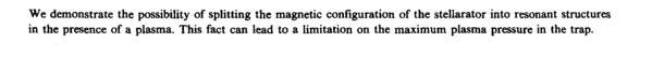 We demonstrate the possibility of splitting the magnetic configuration of the stellarator into resonant structures in the presence of a plasma. This fact can lead to a limitation on the maximum plasma pressure in the trap.