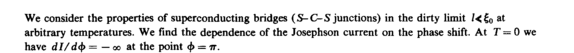 We consider the properties of superconducting bridges (SCS junctions) in the dirty limit /<£0 at arbitrary temperatures. We find the dependence of the Josephson current on the phase shift. At Τ = 0 we have dl/άφ = — oo at the point φ — тт.