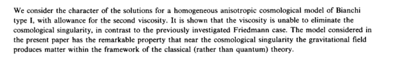 We consider the character of the solutions for a homogeneous anisotropic cosmological model of Bianchi type I, with allowance for the second viscosity. It is shown that the viscosity is unable to eliminate the cosmological singularity, in contrast to the previously investigated Friedmann case. The model considered in the present paper has the remarkable property that near the cosmological singularity the gravitational field produces matter within the framework of the classical (rather than quantum) theory.