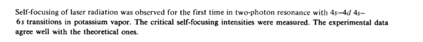 Self-focusing of laser radiation was observed for the first time in two-photon resonance with 4s—4d 4s— 6 s transitions in potassium vapor. The critical self-focusing intensities were measured. The experimental data agree well with the theoretical ones.