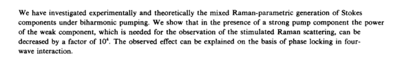 We have investigated experimentally and theoretically the mixed Raman-parametric generation of Stokes components under biharmonic pumping. We show that in the presence of a strong pump component the power of the weak component, which is needed for the observation of the stimulated Raman scattering, can be decreased by a factor of 104. The observed effect can be explained on the basis of phase locking in four-wave interaction.