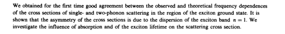 We obtained for the first time good agreement between the observed and theoretical frequency dependences of the cross sections of singleand two-phonon scattering in the region of the exciton ground state. It is shown that the asymmetry of the cross sections is due to the dispersion of the exciton band η — I. We investigate the influence of absorption and of the exciton lifetime on the scattering cross section.