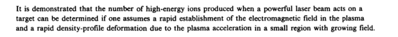 It is demonstrated that the number of high-energy ions produced when a powerful laser beam acts on a target can be determined if one assumes a rapid establishment of the electromagnetic field in the plasma and a rapid density-profile deformation due to the plasma acceleration in a small region with growing field.