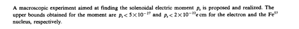 A macroscopic experiment aimed at finding the solenoidal electric moment ps is proposed and realized. The upper bounds obtained for the moment are ps< 5χ 10-27 and ps< 2X 10~22ecm for the electron and the Fe: nucleus, respectively.