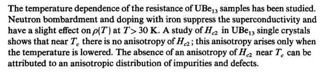 The temperature dependence of the resistance of UBe13 samples has been studied. Neutron bombardment and doping with iron suppress the superconductivity and have a slight effect onp(T) at T> 30 K. A study of Hc2 in UBe13 single crystals shows that near Tc there is no anisotropy of Hc2; this anisotropy arises only when the temperature is lowered. The absence of an anisotropy of Hc2 near Tc can be attributed to an anisotropic distribution of impurities and defects.