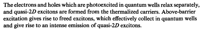 The electrons and holes which are photoexcited in quantum wells relax separately, and quasi-2.D excitons are formed from the thermalized carriers. Above-barrier excitation gives rise to freed excitons, which effectively collect in quantum wells and give rise to an intense emission of quasi-2Z) excitons.