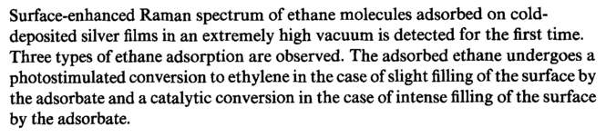 Surface-enhanced Raman spectrum of ethane molecules adsorbed on cold-deposited silver films in an extremely high vacuum is detected for the first time. Three types of ethane adsorption are observed. The adsorbed ethane undergoes a photostimulated conversion to ethylene in the case of slight filling of the surface by the adsorbate and a catalytic conversion in the case of intense filling of the surface by the adsorbate.