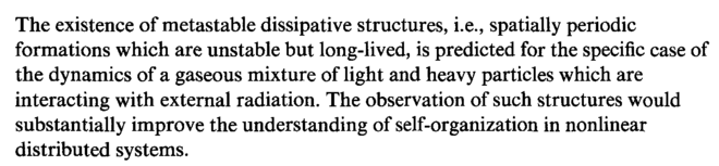 The existence of metastable dissipative structures, i.e., spatially periodic formations which are unstable but long-lived, is predicted for the specific case of the dynamics of a gaseous mixture of light and heavy particles which are interacting with external radiation. The observation of such structures would substantially improve the understanding of self-organization in nonlinear distributed systems.