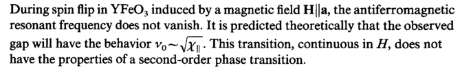 During spin flip in YFe03 induced by a magnetic field H||a, the antiferromagnetic resonant frequency does not vanish. It is predicted theoretically that the observed gap will have the behavior Vo~4x\\This transition, continuous in H, does not have the properties of a second-order phase transition.