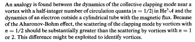An analogy is found between the dynamics of the collective clapping mode near a vortex with a half-integer number of circulation quanta (n — 1/2) in He?~A and the dynamics of an electron outside a cylindrical tube with the magnetic flux. Because of the Aharonov-Bohm effect, the scattering of the clapping mode by vortices with η — 1/2 should be substantially greater than the scattering by vortices with η — 1 or 2. This difference might be exploited to identify vortices.