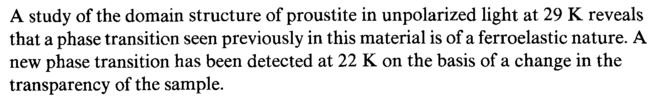 A study of the domain structure of proustite in unpolarized light at 29 К reveals that a phase transition seen previously in this material is of a ferroelastic nature. A new phase transition has been detected at 22 К on the basis of a change in the transparency of the sample.
