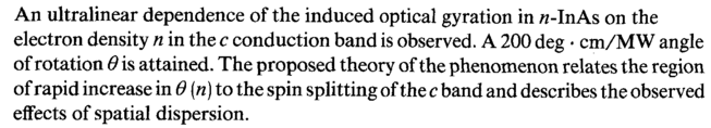 An ultralinear dependence of the induced optical gyration in я-InAs on the electron density η in the с conduction band is observed. A 200 deg · cm/MW angle of rotation Θ is attained. The proposed theory of the phenomenon relates the region of rapid increase in θ (η) to the spin splitting of the с band and describes the observed effects of spatial dispersion.