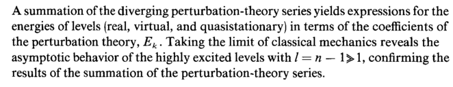 A summation of the diverging perturbation-theory series yields expressions for the energies of levels (real, virtual, and quasistationary) in terms of the coefficients of the perturbation theory, Ek. Taking the limit of classical mechanics reveals the asymptotic behavior of the highly excited levels with l = n— 1> 1, confirming the results of the summation of the perturbation-theory series.