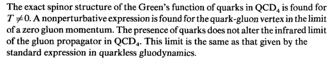 The exact spinor structure of the Green's function of quarks in QCD4 is found for Τ Φ 0. A nonperturbative expression is found for the quark-gluon vertex in the limit of a zero gluon momentum. The presence of quarks does not alter the infrared limit of the gluon propagator in QCD4. This limit is the same as that given by the standard expression in quarkless gluodynamics.