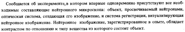 Сообщается об эксперименте, в котором впервые одновременно присутствуют все необходимые составляющие нейтронного микроскопа: объект, просвечиваемый нейтронами, оптическая система, создающая его изображение, и система регистрации, визуализирующая нейтронное изображение. Нейтронное изображение, зарегистрированное в опыте, обладает контрастом по отношению к типу вещества из которого состоит объект.